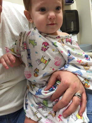- She had her first real illness this month. She's had a few colds and runny nose type things over the year, but this was a full blown illness. She woke up from a nap one morning with a high fever, I gave her Tylenol and it didn't seem to touch her fever but she ate and went back to sleep shortly after and slept through the night. The next day she was still running a high fever when she woke up so we tried Advil and it didn't seem to help either. She ate breakfast but then puked. She fell back asleep but woke up and puked again. We tried a warm shower to get her fever down and it finally came down to under 100. She slept most of the day and continued to not be able to keep much down so I called her peditrician just to get some advice since when she woke up from her nap she was 102.3. I knew they couldn't do much but I wanted advice and they told me to take her to ER. So off we went. They admitted her with a pretty severe UTI and gave her some IV antibiotics and fluids. They chose to keep her overnight to observe her and give her a second round of antibitoics and fluids. While we were there she got an ultrasound of her kidneys and they looked great. So we just waited for her intake to pick up and then we got to come home. So we made it to her first birthday before another hospital admission but I'm grateful for the great care she received and that it was only overnight!